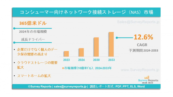 Survey Reports LLCは、2025年3月に消費者向けネットワーク接続ストレージ市場に関する調査レポートを発行したと発表した。このレポートでは、設計(1ベイ、2ベイ、4ベイ、5ベイ、6ベイ、6ベイ以上)、マウントタイプ(スタンドアロン、ラックマウント)、ストレージタイプ(ハードディスクドライブ(HDD)、フラッシュストレージ、ハイブリッド)、 ストレージ容量別(1 TB未満、1 TB~20 TB、20 TB超)、導入形態別(オンプレミス、クラウド/リモート、ハイブリッド)、エンドユーザー別(住宅用、業務用)、製品別(エンタープライズNASソリューション、ミッドマーケットNASソリューション)、企業規模別(小規模企業:10人未満、中規模企業:1,000人未満、大規模企業: >1,000 FTRs) - 消費者向けネットワーク接続ストレージ市場の予測評価を提供する「グローバル市場分析、動向、機会、予測、2024年から2033年」。消費者向けネットワーク接続ストレージ市場の成長促進要因、市場機会、課題、脅威など、いくつかの主要な市場力学を強調している。
