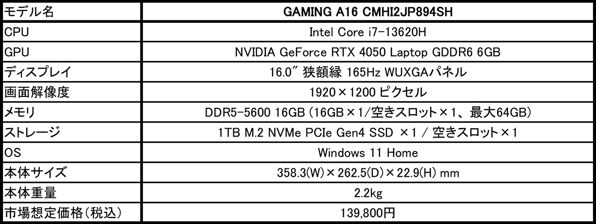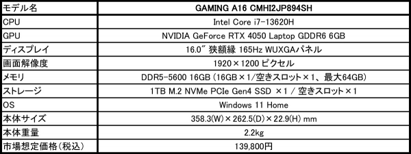 2025年3月27日 - GIGABYTE Technology Co., Ltd. 台湾・新北市 - コンピュータテクノロジーで世界をリードするGIGABYTE Technologyは、CPUに第13世代Intel Core i7プロセッサ、GPUにNVIDIA GeForce RTX 4050 Laptop GPUを搭載した新開発のエントリー向け16.0型AIゲーミングノートPC「GAMING A16 CMHI2JP894SH」をGIGABYTEノートPC取扱店を通して3月28日より販売を開始いたします。市場想定価格(税込)は、139,800円です。