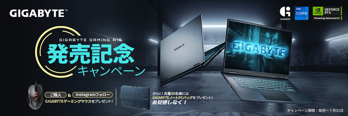GAMING A16 CMHI2JP894SHの発売を記念して、2025年7月31日までに製品を購入し、GIGABYTEのInstagramをフォローした方に、ゲーミングマウス「M6900」をもれなくプレゼントするキャンペーンを実施いたします。さらに、先着30名様にはGIGABYTEオリジナルノートPCバッグもプレゼントいたします。応募締め切りは2025年8月13日。本キャンペーンの詳細につきましては、キャンペーン情報ページをご参照ください。
