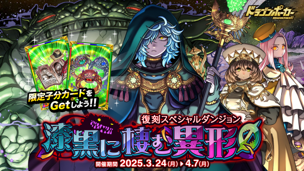株式会社アソビズム(本社:東京都千代田区、代表取締役:大手智之)は、App Store・Google Playにて好評配信中のリアルタイム合体カードバトル『ドラゴンポーカー』で、2025年3月24日(月)より復刻スペシャルダンジョン「漆黒に棲む異形0(ゼロ)」を開催いたします。