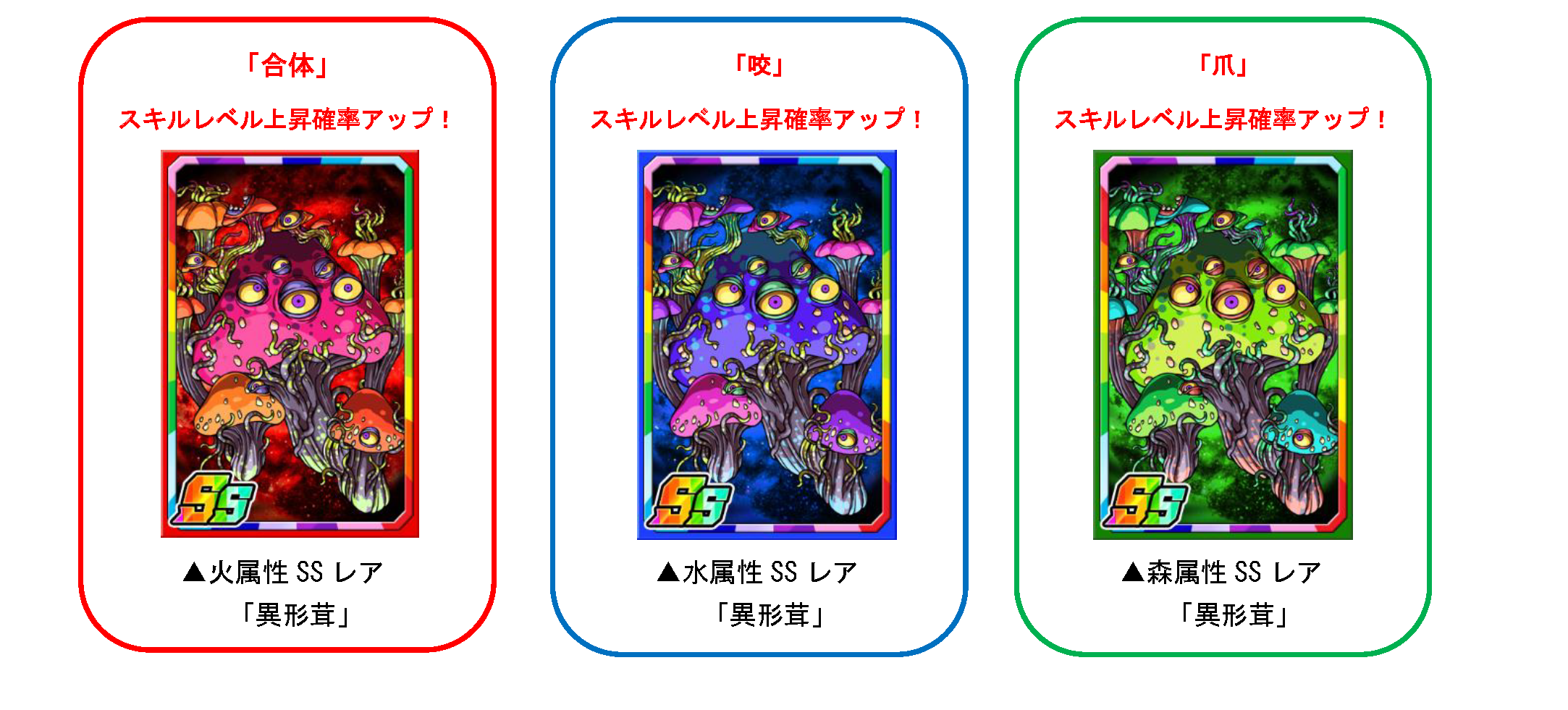 「異形P」を使い素材ガチャを回すと、限定の強化素材「異形茸」を手に入れることができます。一部のモンスターに使うと強化値2倍の効果があるほか、合体・咬・爪のスキルレベル上昇確率もアップします。