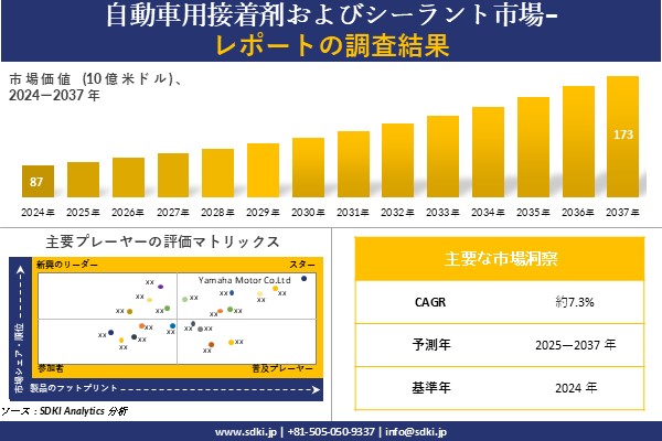 SDKI Analytics(本社:東京都渋谷区)は、このたび、2025年03月19に「自動車用接着剤およびシーラント市場調査レポート:2025-2037年の市場規模、シェア、傾向の予測」を発表しました。自動車用接着剤およびシーラントに関する市場調査レポートには、統計的および分析的アプローチを使用した予測評価が含まれています。この調査レポートでは、一次および二次調査方法を使用して分析された主要な業界洞察を通じて将来の傾向を理解できるようにすることで、主要な市場動向を読者に説明しています。
