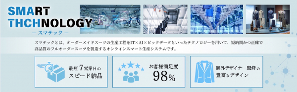 「スマテック」は、AIやビッグデータといったテクノロジーを駆使したオーダースーツブランド並びにスマート生産システムです。