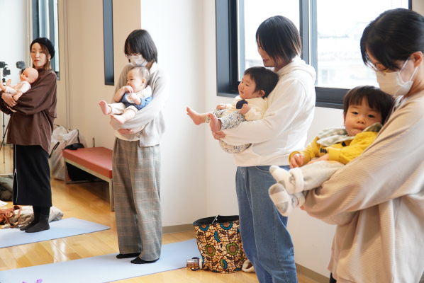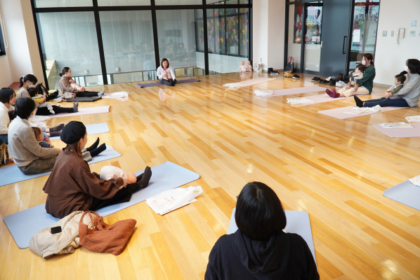 前半は、一般社団法人ボディセンス・インスティテュート 公認インストラクター 曳田彩加が、産前産後の養生法・赤ちゃんとの抱き方や遊びについて紹介していきました。