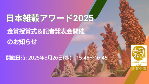 日本雑穀協会が運営する、雑穀を使用した優れた食品を表彰する制度『日本雑穀アワード』において、2025年の金賞受賞商品が決定し、その栄誉を伝える金賞授賞式を3月26日(水)に開催いたします。