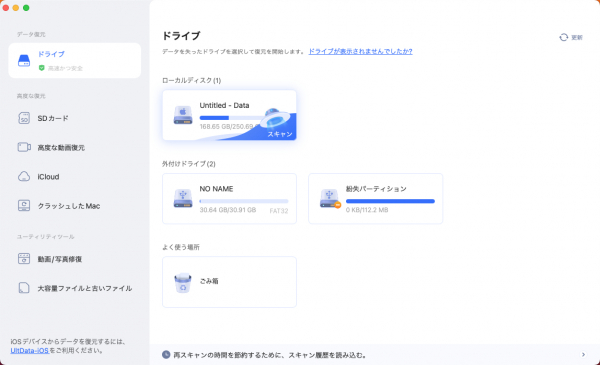 ソフトを起動すると、Macに接続されているドライブやデバイスの一覧が表示されます。データが失われた場所(内蔵HDD/SSD、USBメモリ、SDカードなど)を選択し、「スキャン」ボタンをクリックします。