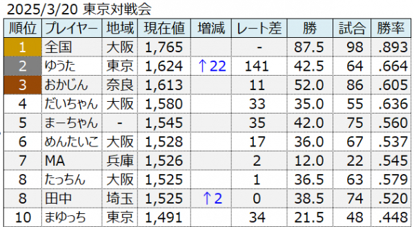 東京・名古屋・大阪の共通レーティングによるランキング(3月20日現在)は、全国大会が1位、ゆうたが2位になります。