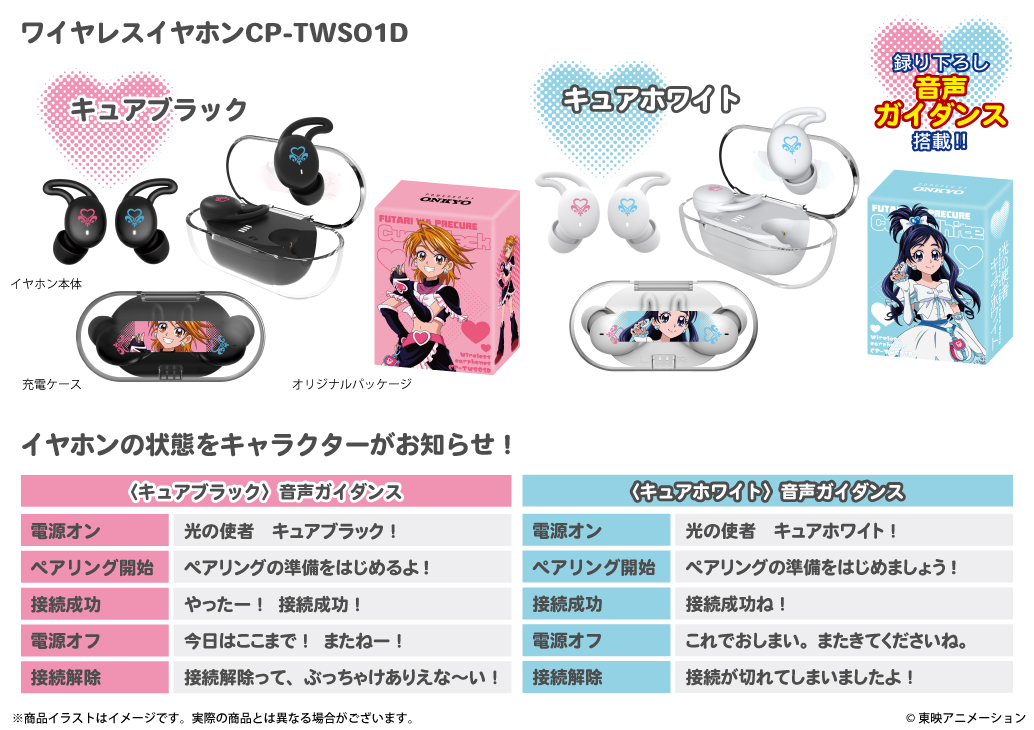 オンキヨー株式会社(所在地:大阪府大阪市、代表取締役社長:大朏 宗徳)は、完全ワイヤレスイヤホン「CP-TWS01D」と『ふたりはプリキュア』※1から「キュアブラック」と「キュアホワイト」のキャラクター録り下ろしボイスを搭載したコラボレーションワイヤレスイヤホンの受注販売をいたします。