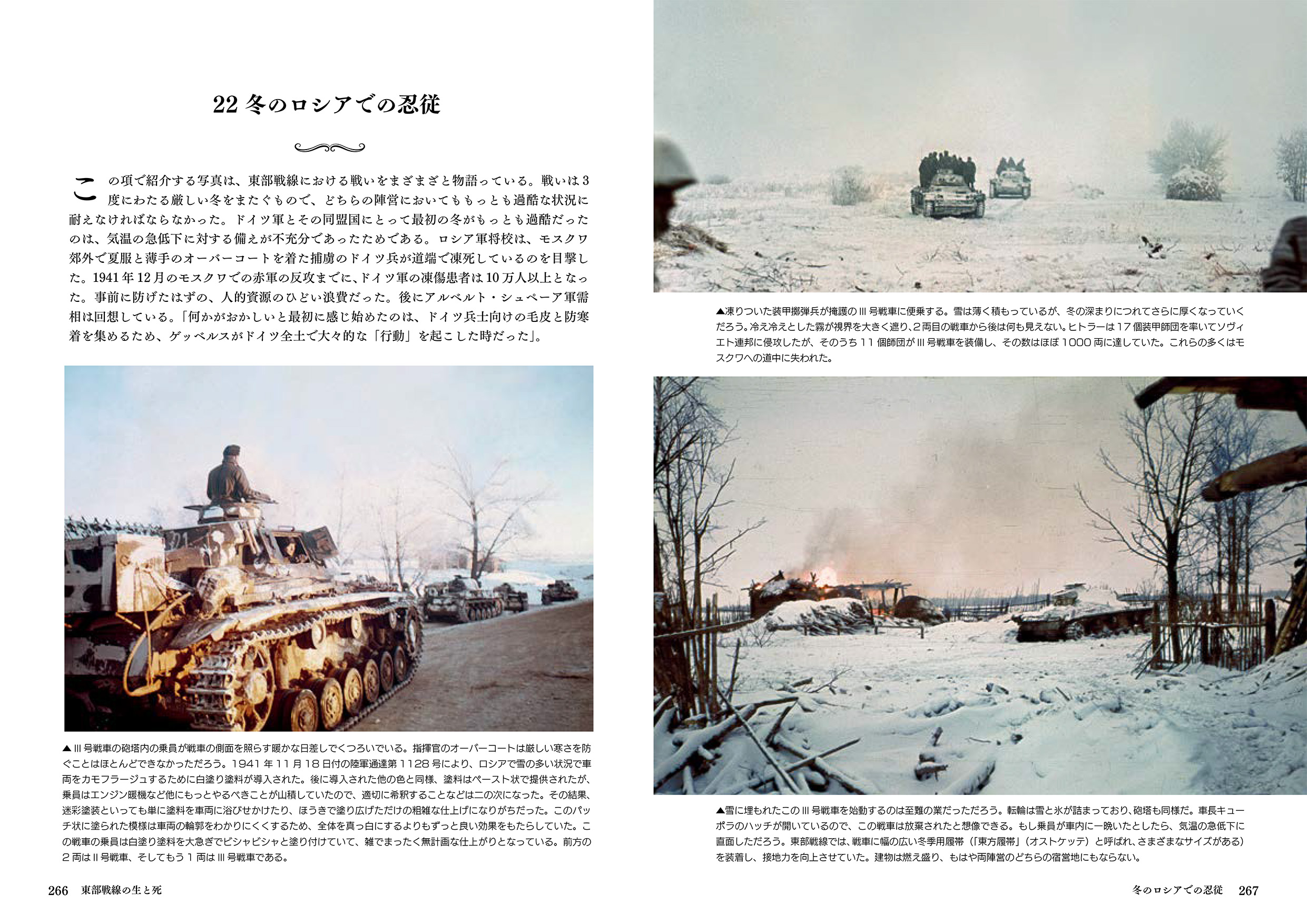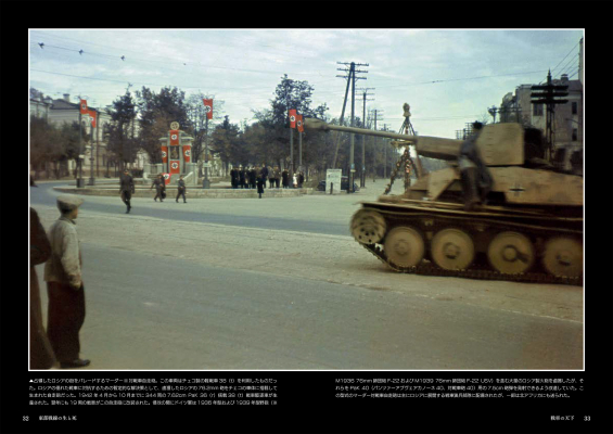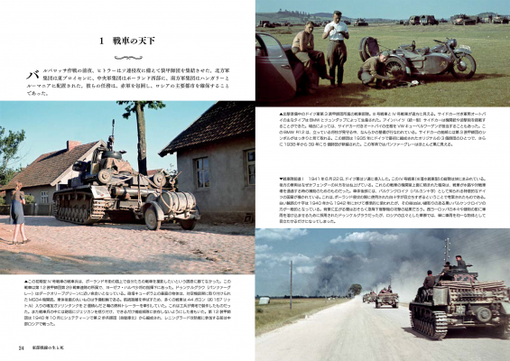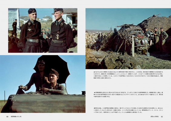 地上戦では独ソ戦双方の戦車、車両、兵器、歩兵のカラー写真。航空戦では、飛行中の航空機や地上の航空機、爆撃機、戦闘機、ドイツ空軍の兵士、戦闘による破壊などが描写され、最後に捕虜、パルチザン、衛生兵、前線の兵士や民間人の日常生活、レジャー活動、ロシアの厳しい冬の影響などが収録され、戦場の裏側へと誘います。