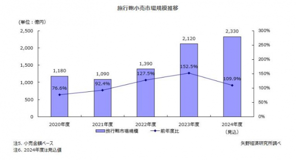 2023年度の旅行鞄小売市場規模は前年度比152.5%の2,120億円となった。旅行鞄において主流となっているスーツケースに対する需要は二極化しており、国内消費者には近隣国への渡航に適した機内持ち込みサイズ、訪日外国人観光客には、日本での購入品を収納するなどの理由から大型サイズが人気となっている。今後も、インバウンド(訪日外国人客)需要の拡大とともに旅行鞄小売市場規模は拡大基調にあるとみる。