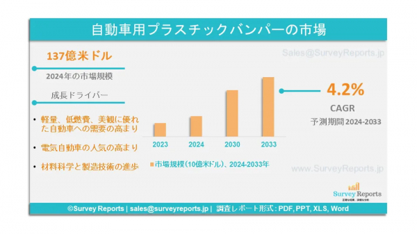 Survey Reports LLCは、2025年3月に調査レポートを発行したと発表した。自動車用プラスチックバンパー市場のセグメンテーション(材料タイプ別(ポリプロピレン(PP)、ポリウレタン(PU)、ポリカーボネート、ABS、その他)、車両タイプ別(乗用車、小型商用車)、製造プロセス別(射出成形、ブロー成形)、用途別(フロントバンパー、リアバンパー) 製造プロセス別(射出成形、押出成形)、販売チャネル別(OEM、アフターマーケット)、バンパータイプ別(フロントバンパー、リアバンパー)、デザイン別(塗装バンパー、未塗装バンパー、テクスチャードバンパー) - 2024年から2033年までの世界市場分析、動向、機会、予測を提供する自動車用プラスチックバンパー市場の予測評価 自動車用プラスチックバンパー市場の成長要因、市場機会、課題、脅威など、いくつかの重要な市場力学に焦点を当てている。