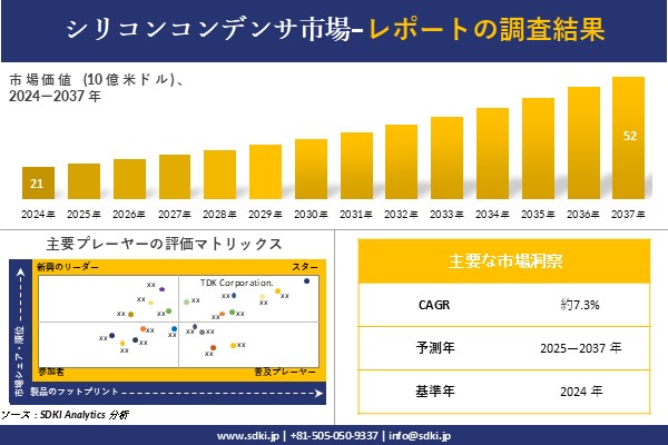 SDKI Analytics(本社:東京都渋谷区)は、このたび、2025年03月24に「シリコンコンデンサ市場調査レポート:2025-2037年の市場規模、シェア、傾向の予測」を発表しました。シリコンコンデンサに関する市場調査レポートには、統計的および分析的アプローチを使用した予測評価が含まれています。この調査レポートでは、一次および二次調査方法を使用して分析された主要な業界洞察を通じて将来の傾向を理解できるようにすることで、主要な市場動向を読者に説明しています。