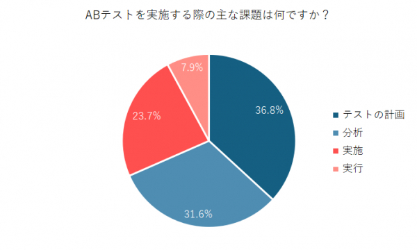 ABテストの課題についてたずねたところ、「テストの計画」36.8%、「分析」31.6%、「実施」23.7%、「実行」7.9%という結果に。ABテストを実施する上での主な課題は、テストの初期段階である「計画」と、結果を意味のある改善に繋げるための「分析」に集中していることがわかりました。