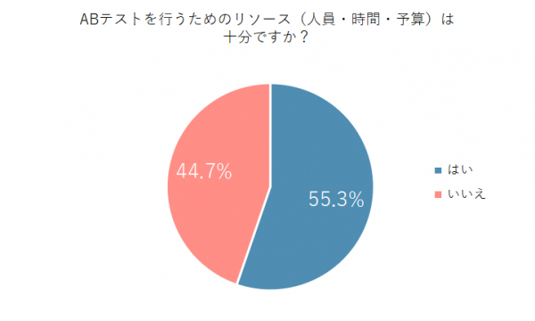 「ABテストを行うためのリソース(人員・時間・予算)は十分ですか」という質問に対し、「はい」と回答した割合は55.3%、「いいえ」と回答した割合は44.7%となりました。この結果は、ABテストの実施において、リソースの確保が依然として重要な課題となっていることを示唆しています。