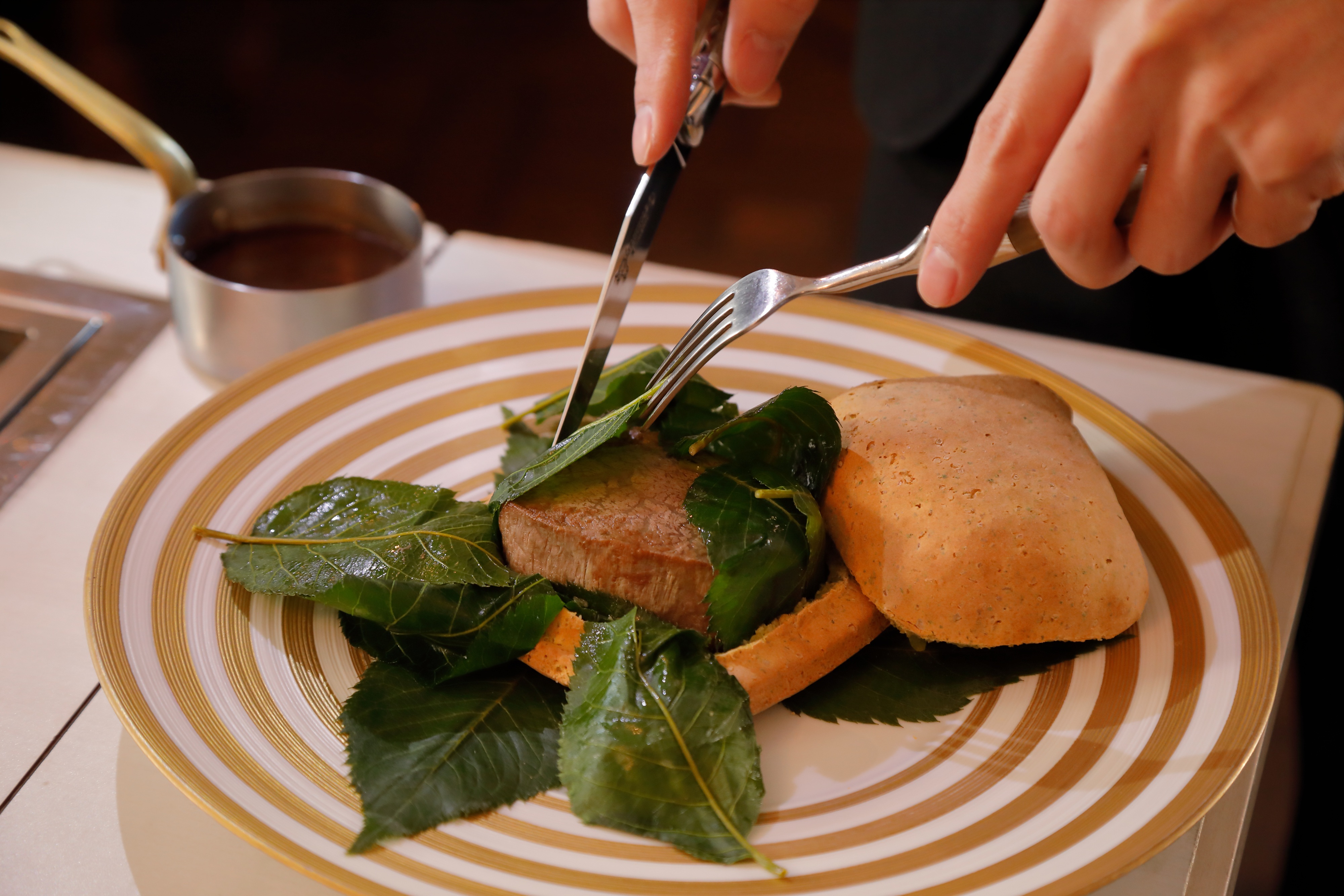 一日一組限定の夜桜プライベートディナーは、円山公園に面した重要文化財長楽館の個室を貸し切って滞在するディナープランです。円山公園の夜桜とLE CHENEのフレンチと、ワインペアリングによるおもてなしで、喧騒から離れた大人の花見を心ゆくまで堪能いただきます。メインディッシュには桜の葉に包んで春の香りを纏わせた京都産丹波牛をお客様の目の前で切り分けてご提供いたします。
