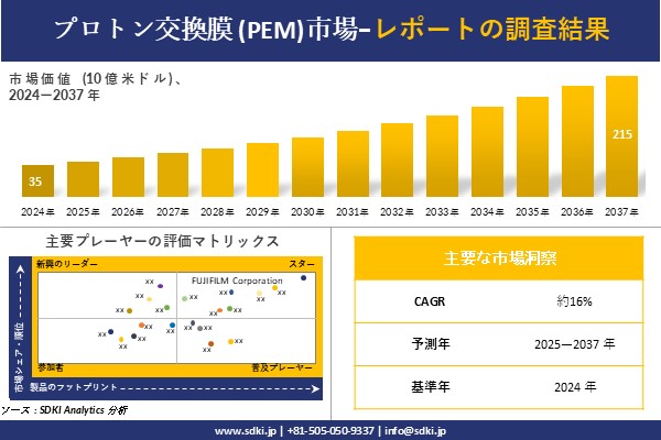 SDKI Analytics(本社:東京都渋谷区)は、このたび、2025年03月27に「プロトン交換膜 (PEM)市場調査レポート:2025-2037年の市場規模、シェア、傾向の予測」を発表しました。プロトン交換膜 (PEM)に関する市場調査レポートには、統計的および分析的アプローチを使用した予測評価が含まれています。この調査レポートでは、一次および二次調査方法を使用して分析された主要な業界洞察を通じて将来の傾向を理解できるようにすることで、主要な市場動向を読者に説明しています。