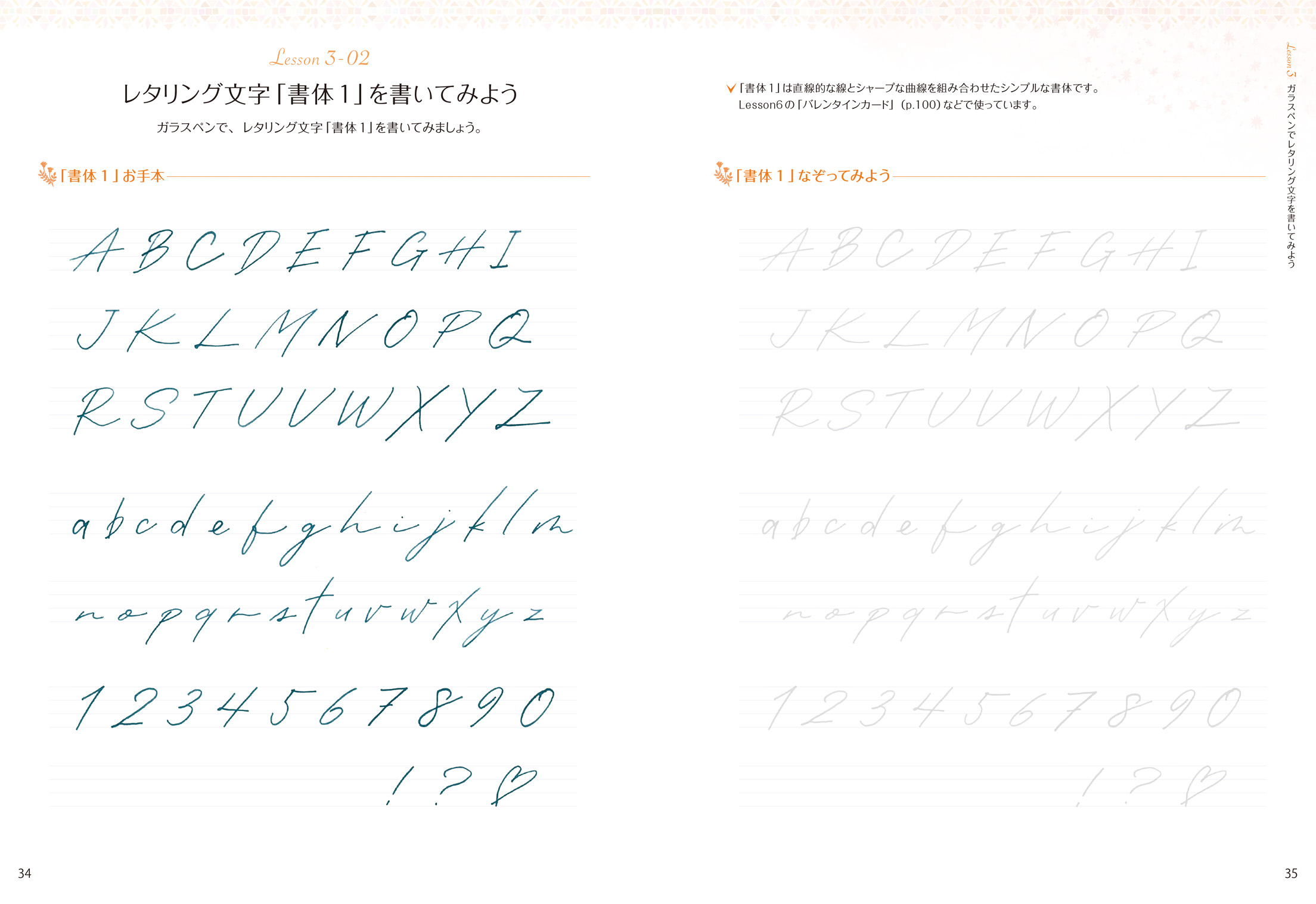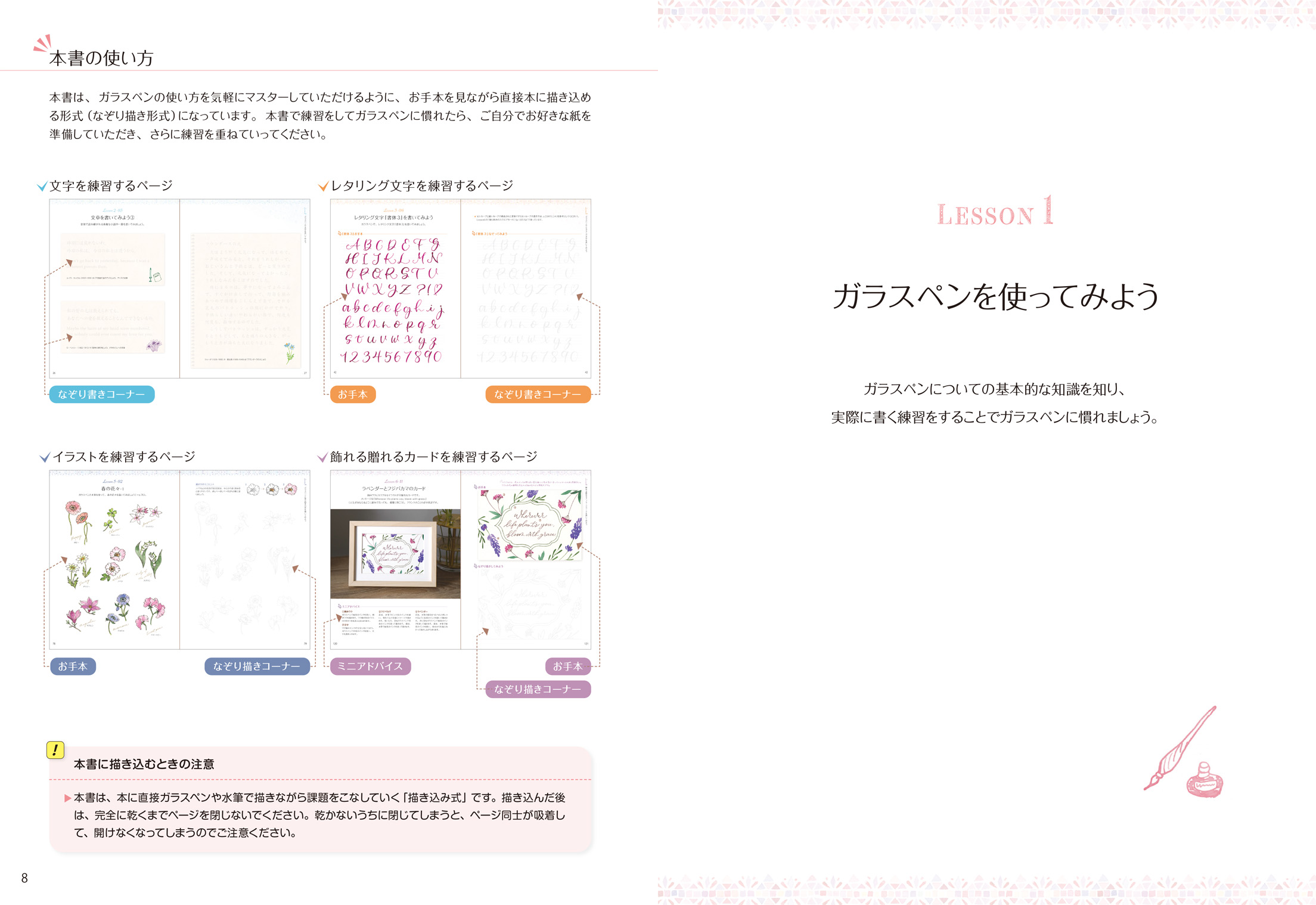 本書は描き込み式のレッスンブックです。著者の櫻井志保が描き下ろした300以上の文字やイラストを、なぞりがきしながら手軽に練習できます。書き方に慣れてきたらおぼえたレタリング文字などを使って、あなただけの作品やメッセージカードを作りましょう。ガラスペンと筆を組み合わせた、かわいい花の描き方なども紹介します。