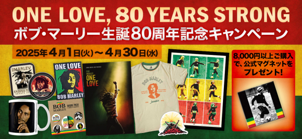 株式会社JAMSHOPPING(代表取締役:遠藤祐一/本社:東京都渋谷区)は、レゲエの伝説的アーティスト、ボブ・マーリーの生誕80周年を記念し、特別キャンペーン「One Love, 80 Years Strong」を、PGS公式オンラインストアにて2025年4月1日より開催いたします。