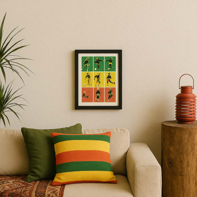 → サッカープレイ中のボブ・マーリーを9カットで構成。赤・黄・緑の背景が映えるポップアート調の額装アイテム。