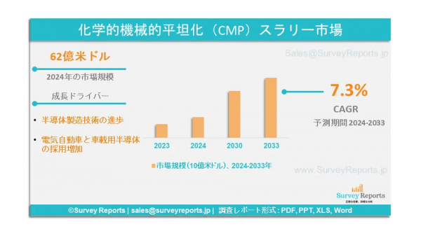 Survey Reports LLCは、2025年4月に化学的機械平坦化(CMP)スラリー市場に関する調査レポートを発行したと発表した。アプリケーション別(集積回路、自動車、MEMSおよびNEMS、光学、化合物半導体、その他)セグメント;技術別(リーディングエッジ、ムーアの法則を超える、新興)セグメント;タイプ別(CMP装置、CMP消耗品(スラリー、パッド、 パッドコンディショナー、その他の消耗品タイプ)、製品タイプ別(自動車、家具、衣類、エレクトロニクス、その他)、エンドユーザー別(住宅用、商業用、娯楽用、個人用、企業用、施設用、その他)、流通チャネル別(Eコマース、実店舗) - 2024年から2033年までの世界市場分析、動向、機会、予測に関する調査レポート。化学的機械平坦化(CMP)スラリー市場の予測評価を提供している。化学的機械平坦化(CMP)スラリー市場の成長促進要因、市場機会、課題、脅威など、いくつかの重要な市場力学に焦点を当てている。