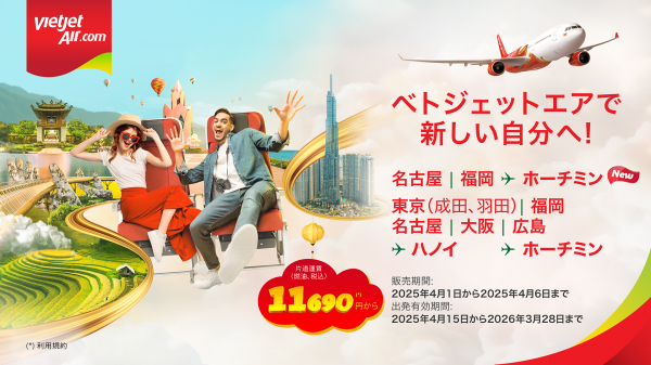 (東京, 2025年4月2日) -ベトジェットは本日から2025年4月5日までの間、東京/大阪/名古屋/福岡 - ハノイ/ホーチミン、広島 - ハノイ線を含む全路線を対象に、エコチケットが片道11,690円(*)からになるチケットプロモーションを実施します。このチケットプロモーションは2025年4月15日から2026年3月28日まで(**)のフライトが対象で、ベトジェット公式サイト https://www.vietjetair.com またはベトジェットエアモバイルアプリよりご予約いただけます。