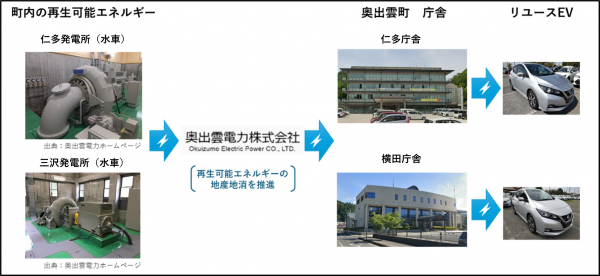 本実証は、奥出雲町で発電した電力を町役場に送電し、リユースEVに充電することで、ゼロカーボン・ドライブの実現を目指す取り組みです。