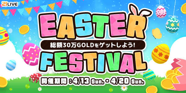 株式会社エムアンドティーティー(本社:沖縄県北谷町、代表取締役:井藤 三知子)が運営するエンターテイメント・ライブ配信アプリ【21LIVE(ニーイチライブ)】URL: https://21.live では、4月13日(日)より『EASTER FESTIVAL』を開催いたします。