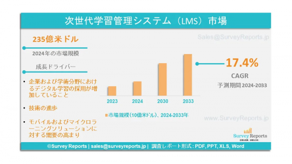 Survey Reports LLCは、2025年4月に次世代学習管理システム(LMS)市場に関する調査レポートを発行したと発表した。コンポーネント(ソリューション、サービス)によるセグメンテーション、配信モード(遠隔学習、講師主導型トレーニング、ブレンド型学習)によるセグメンテーション、企業規模(中小企業、大企業)によるセグメンテーション、導入形態(クラウド、オンプレミス)によるセグメンテーション、用途(従業員トレーニング、コンプライアンストレーニング、製品トレーニング、顧客トレーニング)によるセグメンテーション、 最終用途別(企業(ヘルスケア、銀行、金融サービス、保険(BFSI)、ITおよび通信、小売、製造、政府および防衛、その他)、学術機関(K-12、高等教育)) - グローバル市場分析、動向、機会、予測、2024年から2033年は、次世代学習管理システム(LMS)市場の予測評価を提供する。次世代学習管理システム(LMS)市場の成長要因、市場機会、課題、脅威など、いくつかの重要な市場力学に焦点を当てている。