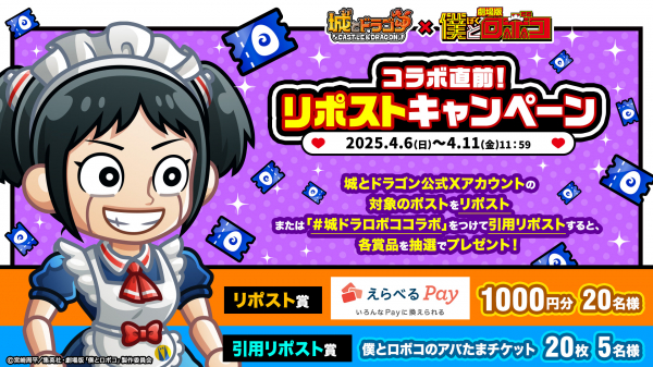 コラボ開催を記念して、「コラボ直前!リポストキャンペーン」を実施中です。『城とドラゴン』公式Xアカウント(@shirotodoragon)が投稿したキャンペーン対象ポストを公式リポスト、またはハッシュタグ「#城ドラロボココラボ」をつけて引用リポストされた方の中から抽選で各賞品をプレゼント!ぜひ引用リポストする際はハッシュタグとあわせて、「コラボイベントが発表された時の感想」や「コラボイベントの楽しみにしているポイント」などもコメントしてみてください!