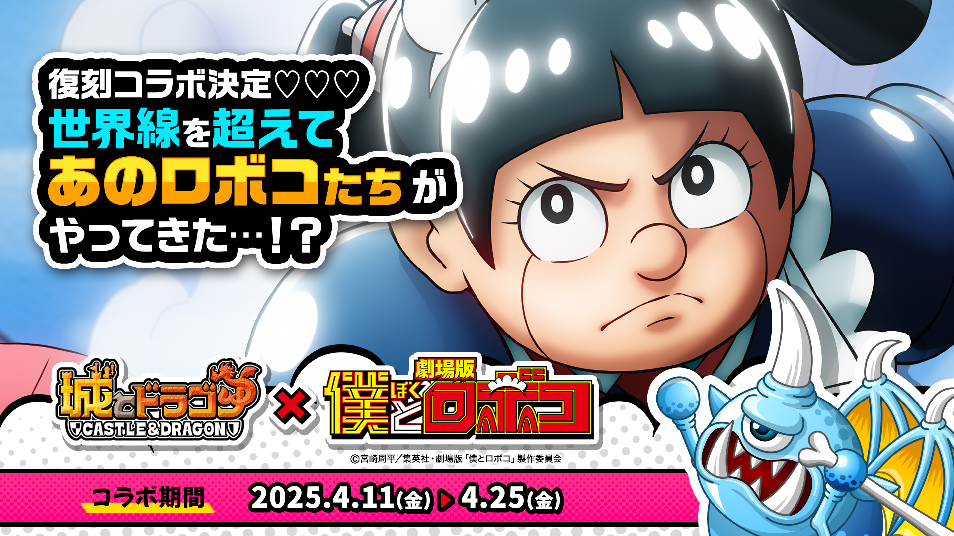 4月11日(金)より『城とドラゴン』にて、劇場版『僕とロボコ』とのコラボイベントを開催することが決定いたしました。今回は4月18日(金)に公開を控えた劇場版との復刻コラボ!コラボ限定キャラとして「ロボコ」が『城とドラゴン』に再登場するほか、4月6日(日)からは「コラボ直前!リポストキャンペーン」がコラボに先駆けて開催中です。キャンペーンへのご参加お待ちしております!