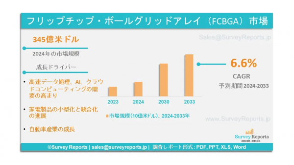 Survey Reports LLCは、2025年4月にフリップチップボールグリッドアレイ市場に関する調査レポートを発行したと発表した。はんだ(銅、スズ、スズ-鉛、鉛フリー、高鉛、金、導電性エポキシ接着剤、共晶、その他)による分類、基板(積層板、セラミック、ポリアミド、ガラス、シリコン、その他)による分類、 接合方法別(密着機構、冶金接合、直接接合、水素結合、機械的インターロック、ガラス結合)、はんだ工法別(はんだバンプ、スタッドバンプ、接着剤バンプ)、用途別(メモリ系、RF、アナログ、ミックスドシグナルおよびパワーIC(2D IC、2.5D IC、3D IC)、センサ(赤外線センサ、 CMOSイメージセンサ、その他)、発光ダイオード、中央処理装置、グラフィックプロセッシングユニット、システムオンチップ、光デバイス、マイクロエレクトロメカニカルシステム(MEMS)デバイス、表面弾性波(SAW)デバイス、その他)、エンドユーザー別(民生用電子機器、自動車、産業機器、ヘルスケア、軍事および防衛、航空宇宙、ITおよびテレコム、通信、その他)、ウェハバンピングプロセス別(銅ピラー、 鉛フリー、錫鉛、金スタッド)、パッケージタイプ別(FC BGA、FC QFN、FC CSP、FC SiN)、製品タイプ別(ベアダイFCBGA、SiP FCBGA、リッド付きFCBGA)、タイプ別(標準BGA、ファインピッチBGA、マイクロBGA、超ファインピッチBGA、高密度BGA)、材料別(はんだボール、シリコン、 エポキシ、ポリイミド、銅)、技術別(鉛フリー技術、スルーホール技術、表面実装技術(SMT)、ボールグリッドアレイ(BGA)技術、チップオンボード(COB)技術) - フリップチップボールグリッドアレイ市場の予測評価を提供する世界市場分析、動向、機会、予測、2024年から2033年。フリップチップボールグリッドアレイ市場の成長要因、市場機会、課題、脅威など、いくつかの重要な市場力学に焦点を当てている。