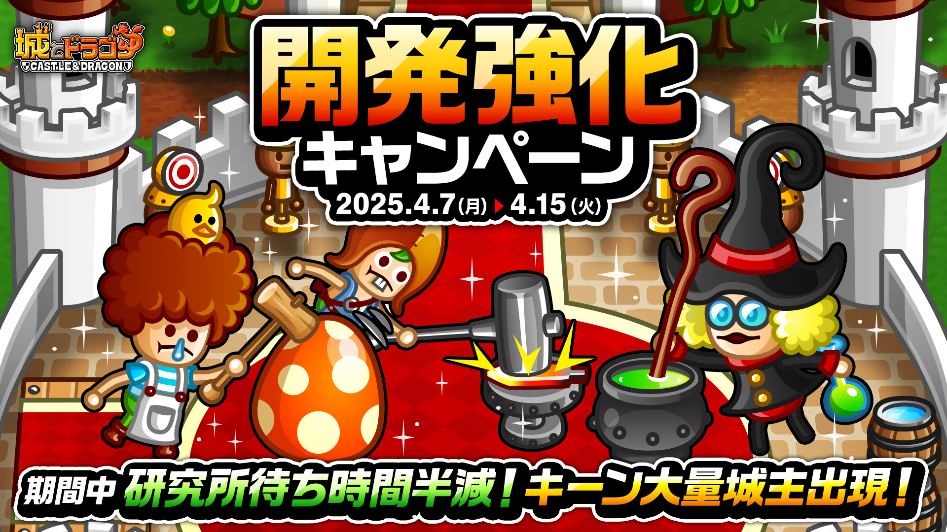 キャラ育成がはかどるキャッスルイベント「研究所待ち時間半減キャンペーン」と、バトルイベント「キーン大量城主出現キャンペーン」を開催いたします。
