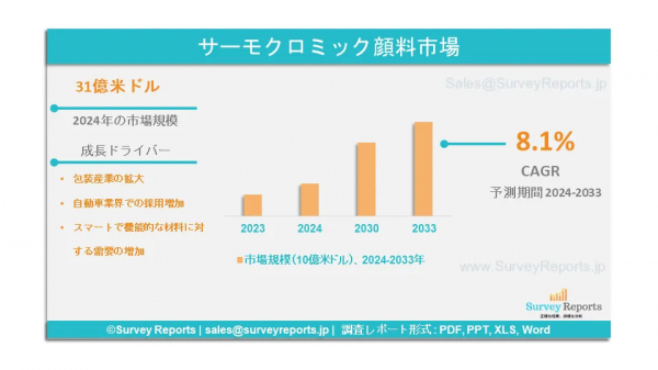 サーベイレポートの専門家は、サーモクロミック顔料市場の調査分析を行い、2024年のサーモクロミック顔料市場規模は31億米ドルに達すると予測した。さらに、サーモクロミック顔料市場のシェアは、2033年末までに61億米ドルに達すると予測されている。サーモクロミック顔料市場は、2024年から2033年の予測期間にわたって、年間平均成長率(CAGR)約8.1%で成長すると予測されている。