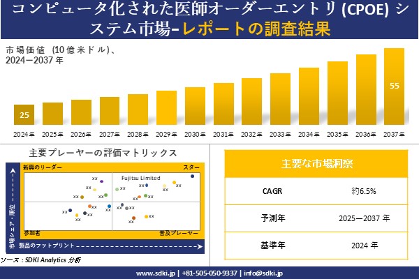 SDKI Analytics(本社:東京都渋谷区)は、このたび、2025年04月01に「コンピュータ化された医師オーダーエントリ (CPOE) システム市場調査レポート:2025-2037年の市場規模、シェア、傾向の予測」を発表しました。コンピュータ化された医師オーダーエントリ (CPOE) システムに関する市場調査レポートには、統計的および分析的アプローチを使用した予測評価が含まれています。この調査レポートでは、一次および二次調査方法を使用して分析された主要な業界洞察を通じて将来の傾向を理解できるようにすることで、主要な市場動向を読者に説明しています。
