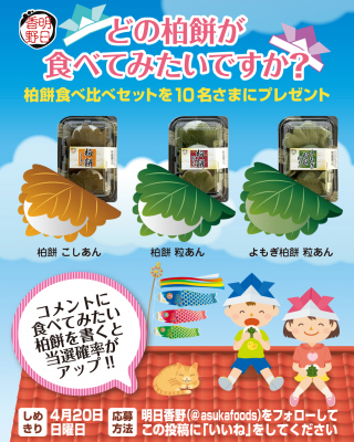 このたび、弊社が運営するSNS(明日香野【公式】X、明日香野【公式】Instagram)にて、季節の和菓子をプレゼントするキャンペーン「どの柏餅が食べてみたいですか?」を開始しました。キャンペーンの開催期間は2025年4月7日から4月20日までとなります。