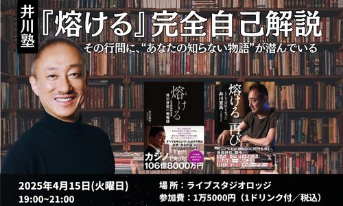 次回の井川塾は2025年4月15日(火)19時より、東京・代々木のLIVE STUDIO LODGEにて開催されます。テーマはズバリ、井川意高氏自身によるベストセラー懺悔録『熔ける』シリーズの“完全自己解説”です。井川氏の人生第2章の幕開けとなった衝撃の告白録『熔ける』、そしてその続編『熔ける 再び』は、いずれも読者の心に焼け焦げるような感情を残す問題作として大きな話題を呼びました。本イベントでは、それら2冊について著者本人が初めて朗読を交えながら語り尽くす一夜となります。栄光から破滅、そして再生へ至る井川氏自身の物語の真相が、この場で明かされるのです。