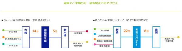 最寄駅:国際展示場駅(下車 徒歩約7分)、東京ビッグサイト駅 (下車 徒歩約3分)、都営浅草線・大江戸駅の大門駅B2出口から 徒歩約7分