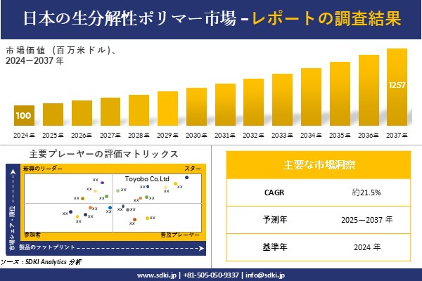 SDKI Analytics(本社:東京都渋谷区)は、このたび、2025年04月03に「日本の生分解性ポリマー市場調査レポート:2025-2037年の市場規模、シェア、傾向の予測」を発表しました。日本の生分解性ポリマーに関する市場調査レポートには、統計的および分析的アプローチを使用した予測評価が含まれています。この調査レポートでは、一次および二次調査方法を使用して分析された主要な業界洞察を通じて将来の傾向を理解できるようにすることで、主要な市場動向を読者に説明しています。