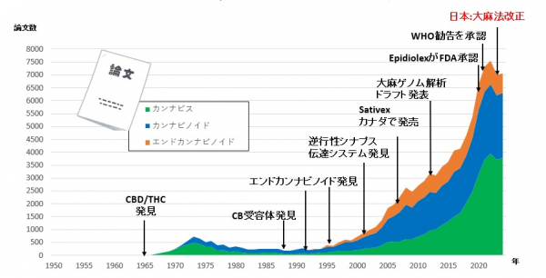 図:1950年から2024年までのカンナビノイド医学系論文の発行数(PubMedのみ)