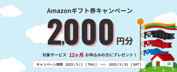 →上記サービスを契約期間12ヶ月間でご契約いただくと、Amazonギフト券2,000円分をプレゼント!