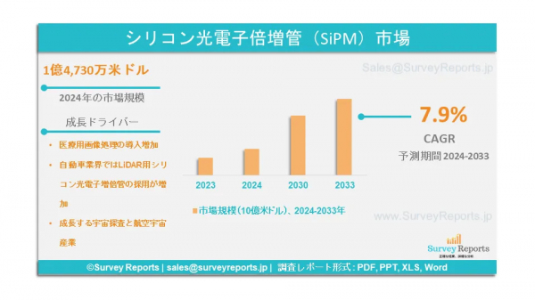 Survey Reports LLCは、2025年4月、シリコン光電子増倍管(SiPM)市場のセグメンテーションに関する調査レポートを発行したと発表した。提供内容別(近紫外線用シリコン光電子増倍管、赤色用、緑色用、青色用シリコン光電子増倍管)、タイプ別(アナログ、デジタル)、用途別(LiDARおよび3D測距、バイオフォトニクスおよび医療用画像処理、高エネルギー物理学、放射線検出およびモニタリング、 フローサイトメトリー)別、エンドユーザー別(ヘルスケア、自動車、家電および通信、航空宇宙、石油・ガス、その他) - 2024年から2033年までの世界市場分析、動向、機会、予測を提供するシリコン光電子増倍管(SiPM)市場の予測評価。シリコン光電子増倍管(SiPM)市場の成長促進要因、市場機会、課題、脅威など、いくつかの重要な市場力学を強調している。
