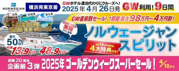 クルーズ予約サイト「ベストワンクルーズ」運営の株式会社ベストワンドットコム(本社:東京都新宿区、代表取締役:澤田秀太、野本洋平)は、本日より、4月26日発ノルウェージャンスピリット横浜発東京着ゴールデンウィーククルーズの割引・特典内容を追加いたしました。