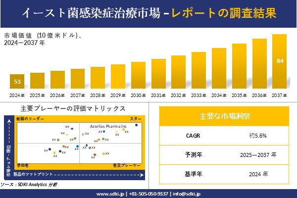 SDKI Analytics(本社:東京都渋谷区)は、このたび、2025年04月07に「イースト菌感染症治療市場調査レポート:2025-2037年の市場規模、シェア、傾向の予測」を発表しました。イースト菌感染症治療に関する市場調査レポートには、統計的および分析的アプローチを使用した予測評価が含まれています。この調査レポートでは、一次および二次調査方法を使用して分析された主要な業界洞察を通じて将来の傾向を理解できるようにすることで、主要な市場動向を読者に説明しています。