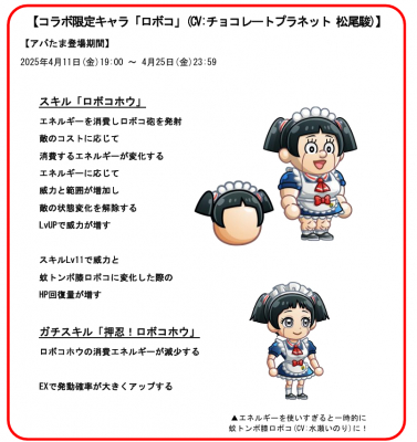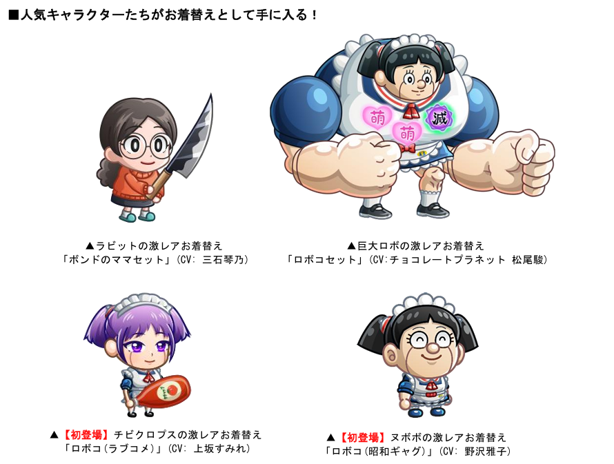 「僕とロボコのアバたま」に限定キャラ「ロボコ(CV:チョコレートプラネット 松尾駿)」が登場し、初回当選でキャラタマゴとして入手できます。以降、当選回数に応じて「制服」「JK」「ナース服」「アイドル衣装」「水着」のお着替えが、また新たに「ロボコ(王道バトル) (CV:田中真弓)」と「ロボコ(本格SF) (CV: 千葉繁)」も排出されます。なお「ロボコ」は、エネルギーを使いすぎると一時的に「蚊トンボ膝ロボコ(CV:水瀬いのり)」に切り替わる仕様!