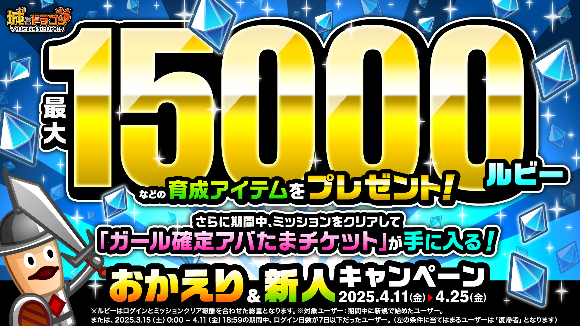 4月11日(金)より、対象ユーザーに最大15,000ルビーや「金の友トレ倶楽部」などが贈られる「おかえり&新人キャンペーン」が開催されま。期間中、対象ユーザー向けのミッションをクリアすると「ガール確定アバたまチケット」も手に入ります。