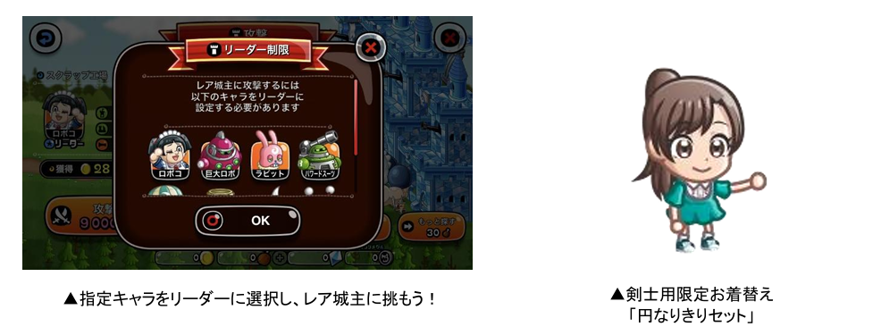 「バトル」から「ひとりで」または「みんなで」を選び、「攻撃」を選択すると、ランダムでレア城主が出現する「レア城主イベント」を開催いたします。まれに「特別な城」と遭遇し、条件をクリアすると剣士用限定お着替え「円なりきりセット」がもらえます。