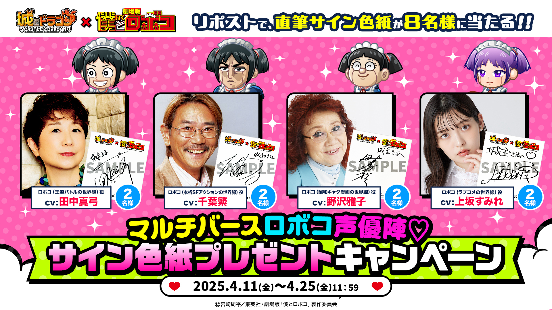 4月11日(金)より、「マルチバースロボコ声優陣(ハード)サイン色紙プレゼントキャンペーン」を実施。『城とドラゴン』公式Xの対象ポストをリポストしていただいた方の中から抽選で8名様に「豪華サイン色紙」をプレゼントいたします。