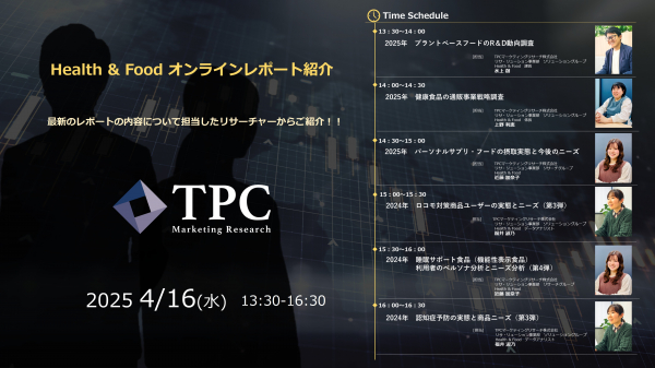 リサ・リューション事業を展開するTPCマーケティングリサーチ株式会社(代表取締役社長:松本 竜馬)は、2025年4月16日にHealth & Foodオンラインレポート紹介を開催いたします。