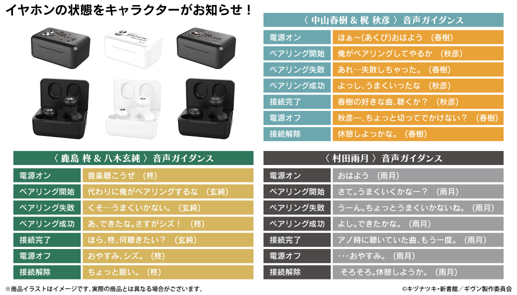 本コラボレーションモデルは「中山春樹&梶 秋彦」「鹿島 柊&八木玄純」「村田雨月」の3モデルで、左右のハウジング、充電ケースには各キャラクターの象徴となるマークを装飾したシンプルでありながら世界観を本体に落とし込んだ商品となっております。