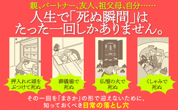 つまずいて死ぬ/押入れに頭をぶつけて死ぬ/エアコンで死ぬ/仏壇の火で死ぬ/睡眠薬で死ぬ/薬の包装シートで死にかける/タンス貯金で死ぬ/七輪を使用して死ぬ/農薬を飲んで死ぬ/ペットに咬まれて死ぬ/雪下ろしで死ぬ/作り置き料理で死にかける/ゴミ屋敷で死ぬ